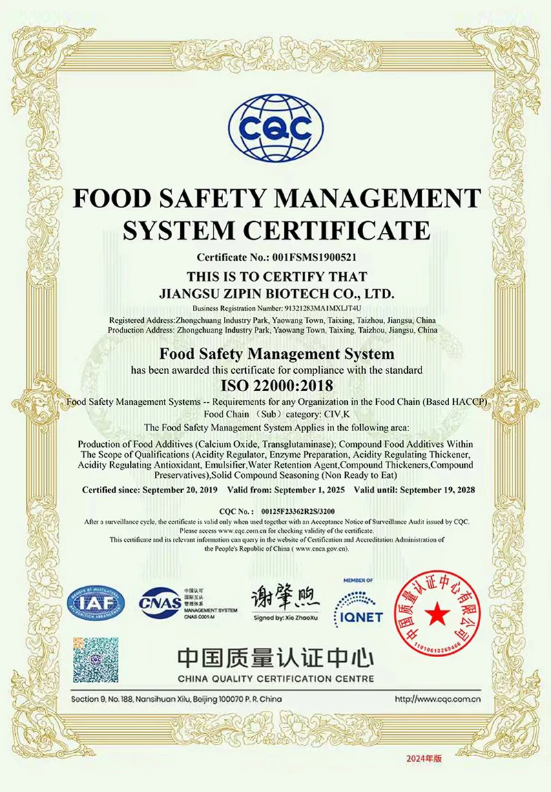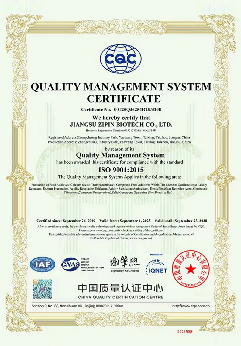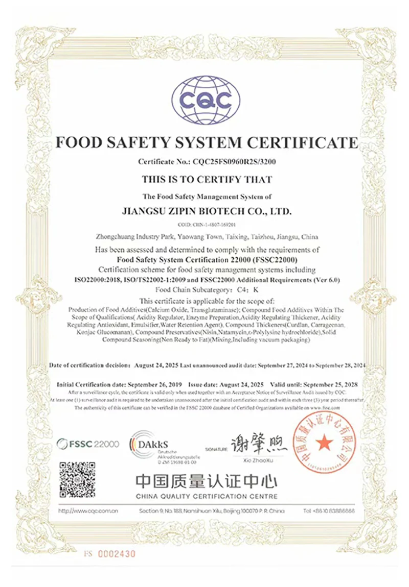 Јиангсу Зипин Биотецх Цо., Лтд. основан је 2016. године, покривајући површину од 20.000㎡. Као модерно приватно предузеће, сада се углавном бавимо истраживањем и развојем, производњом и продајом адитива за храну. Наши главни производи суТрансглутаминаза, Цурдлан, ε-полилизин, Нисин, Натамицин и други адитиви за храну.